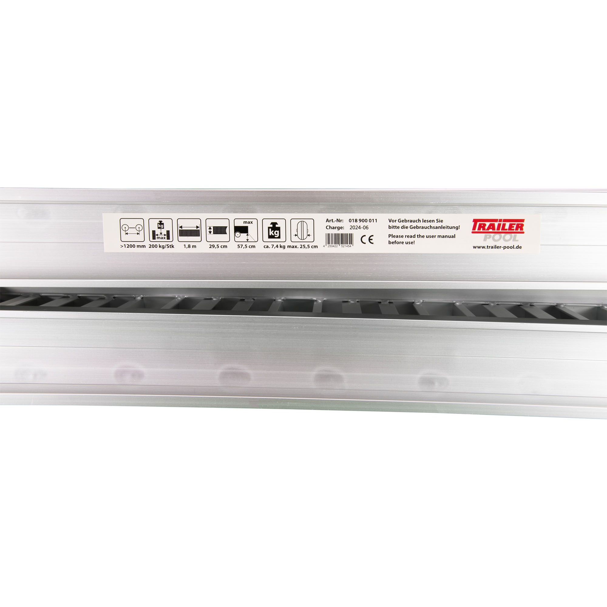 Loading ramp, foldable with edge Material aluminum Length 1800 mm Inner width 250 mm Outer width 295 mm Height 60 mm Height difference 517 – 575 mm (at 30 % gradient) Load capacity by wheelbase: >1200 mm: 200 kg Attention: With a smaller centre distance or point load, the load capacity may be reduced by up to 50%. Follow general safety instructions.