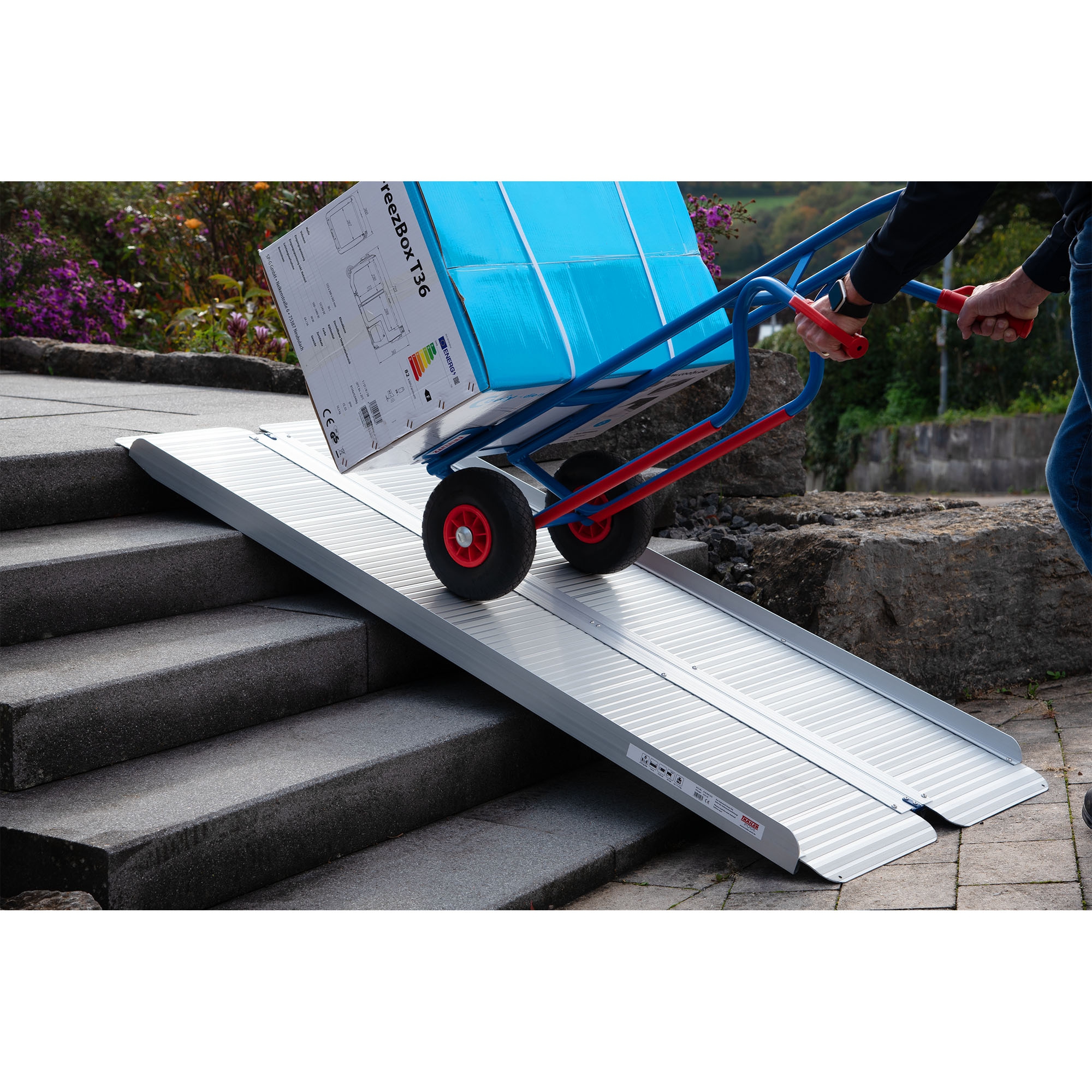 Loading Ramp, foldable lengthwise with edge Material Aluminium Length 1800 mm Internal width 715 mm External width 728 mm Construction height 65 mm Height difference 388 - 430 mm (at 30 % gradient) Load capacity by wheelbase: >1200 mm: 270 kg Attention: With a smaller centre distance or point load, the load capacity may be reduced by up to 50%. Follow general safety instructions.