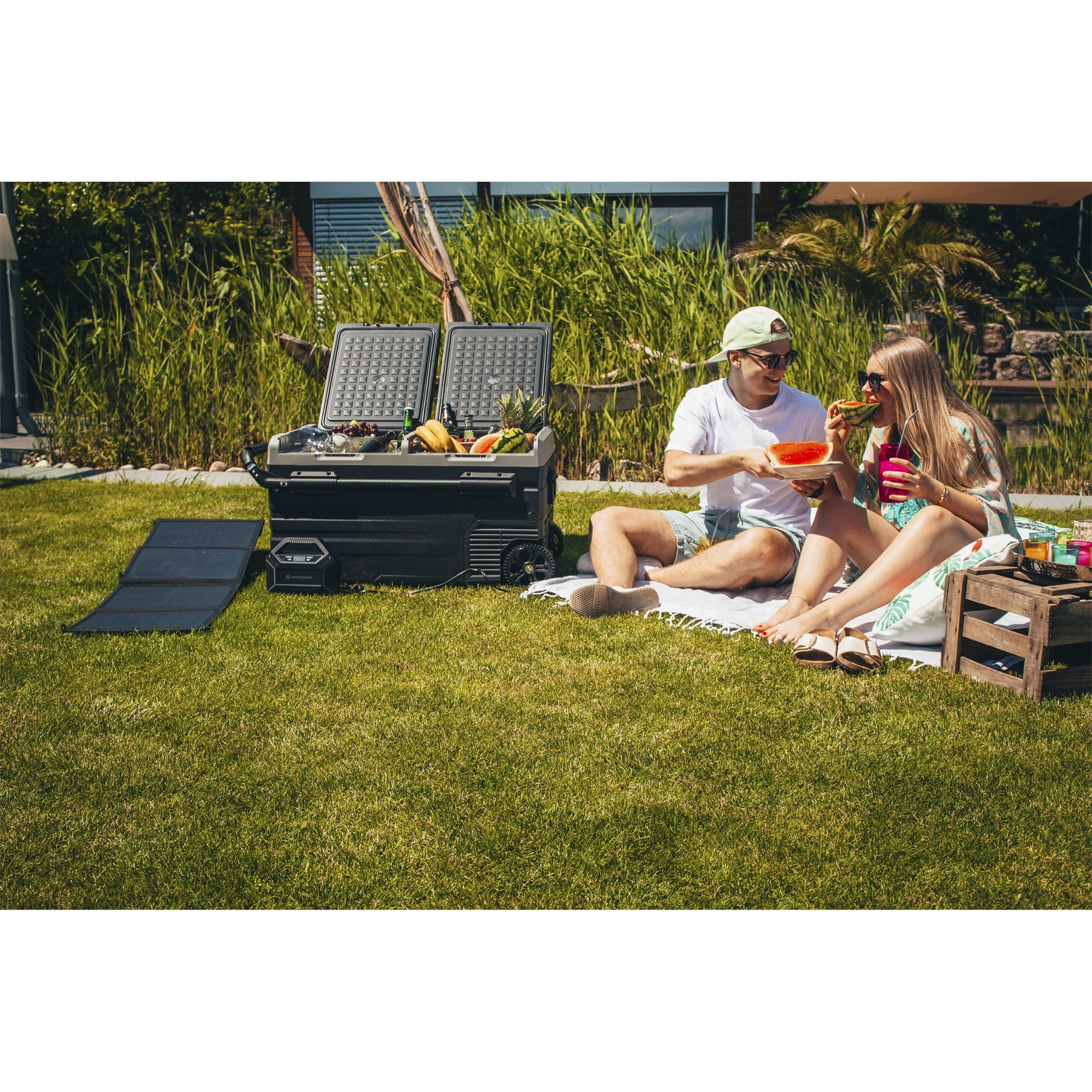 Portable Fridge Freezbox TWW75 with wheels with basket inside Measures 937 x 535 x 462 mm Packing size 976 x 572 x 528 mm Capacity 75 L Input voltage 12/24V DC Input voltage with power adapter 110~240V AC Total input power 80 W Rated current for DC 6A / 3A Temperature range -20°C to +20°C Without heater Refrigerant R134a/0,080 kg Colour grey Certification CE, GS Energy efficiency class F Packing list: 1x refrigerator, 1x DC power cord, 1x AC adapter, 2x basket insert, 1x user's manual, 1x energy label