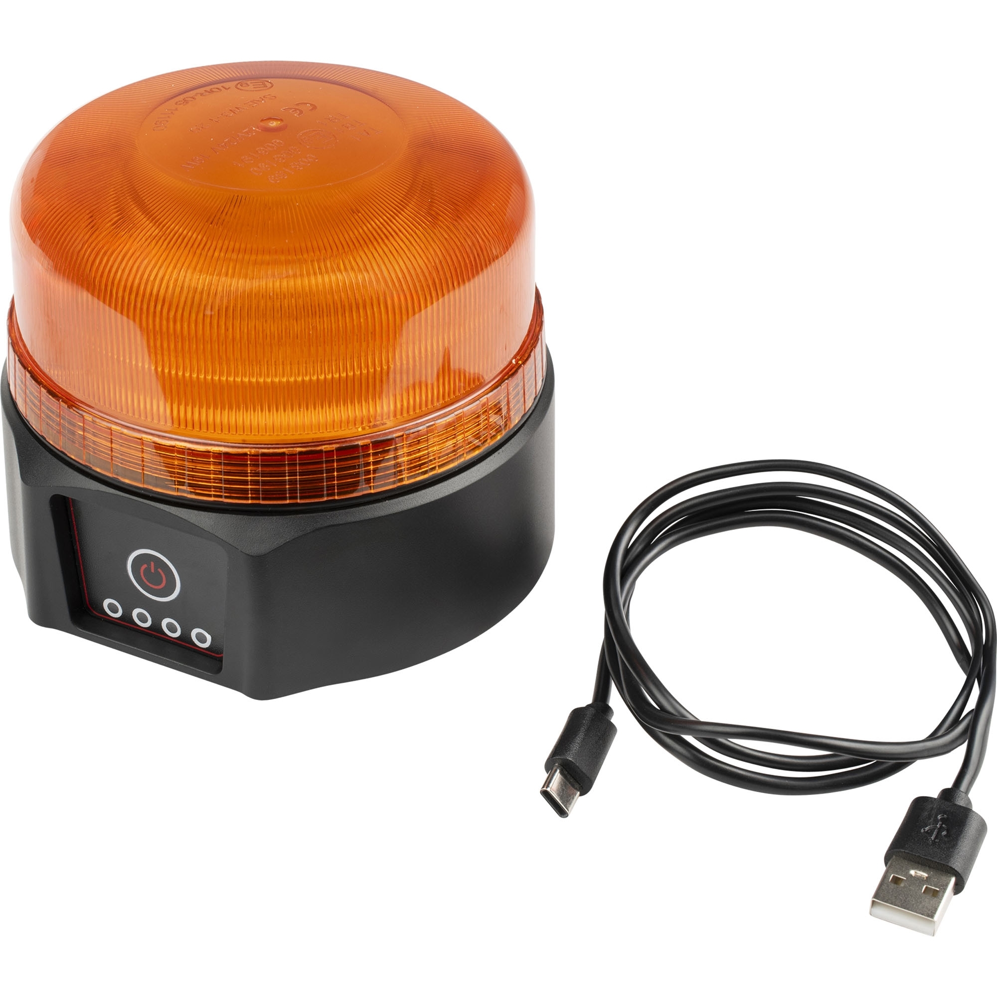 Rotating beacon LED flat with single and double flash Color yellow with magnetic foot mount with battery, rechargeable via USB cable Rated power 54 W Ø 123 mm Height 98 mm Temperature range -30°C to 50°C Max speed 80 km/h Protection class IP66 ECE R10 and R65 certification