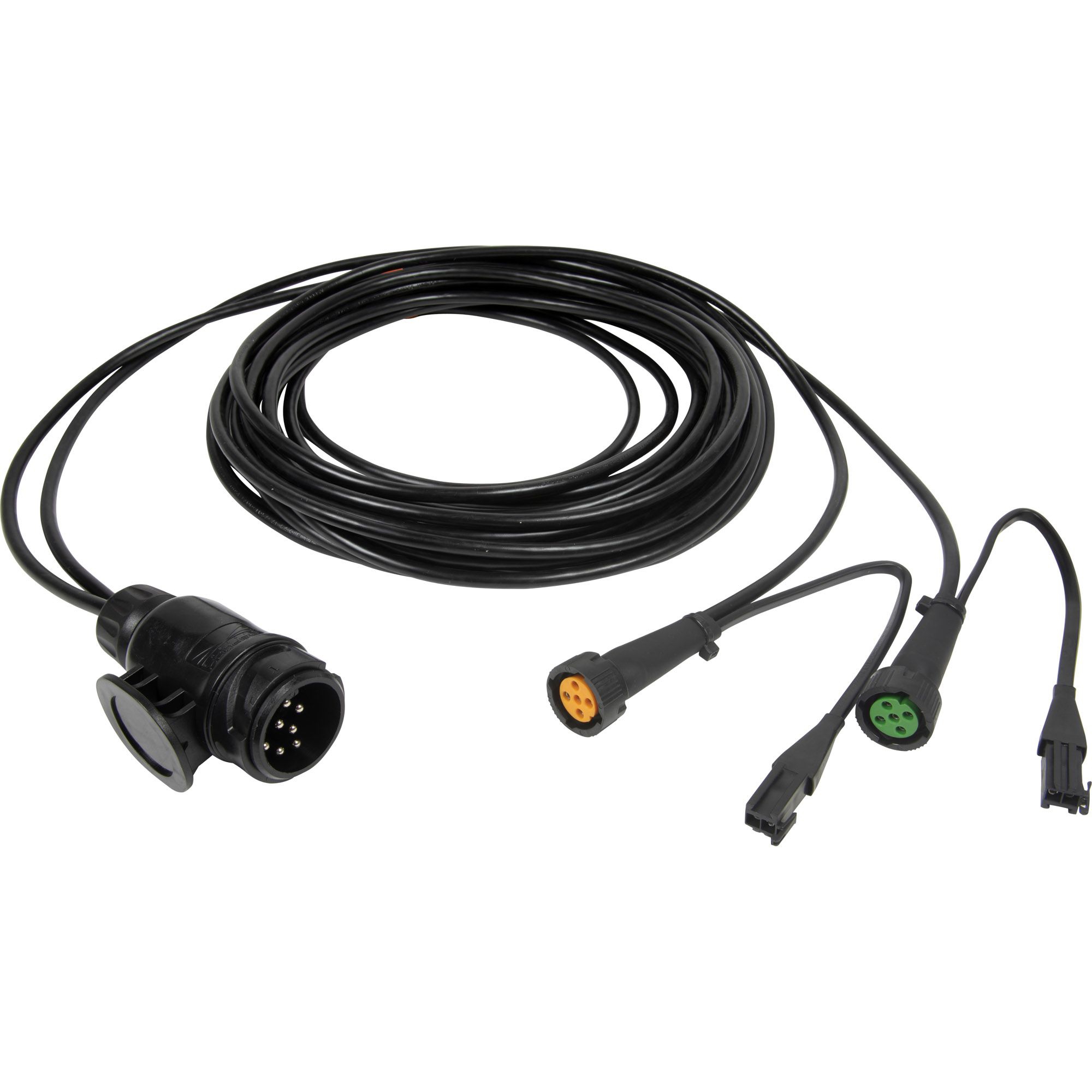 Supply cable 13 pin suitable for Aspöck and Jokon 5-pin bayonet connector Connector yellow/grey = left, green/white = right Length main cable 7000 mm 2 x 2-pin connector 200 mm