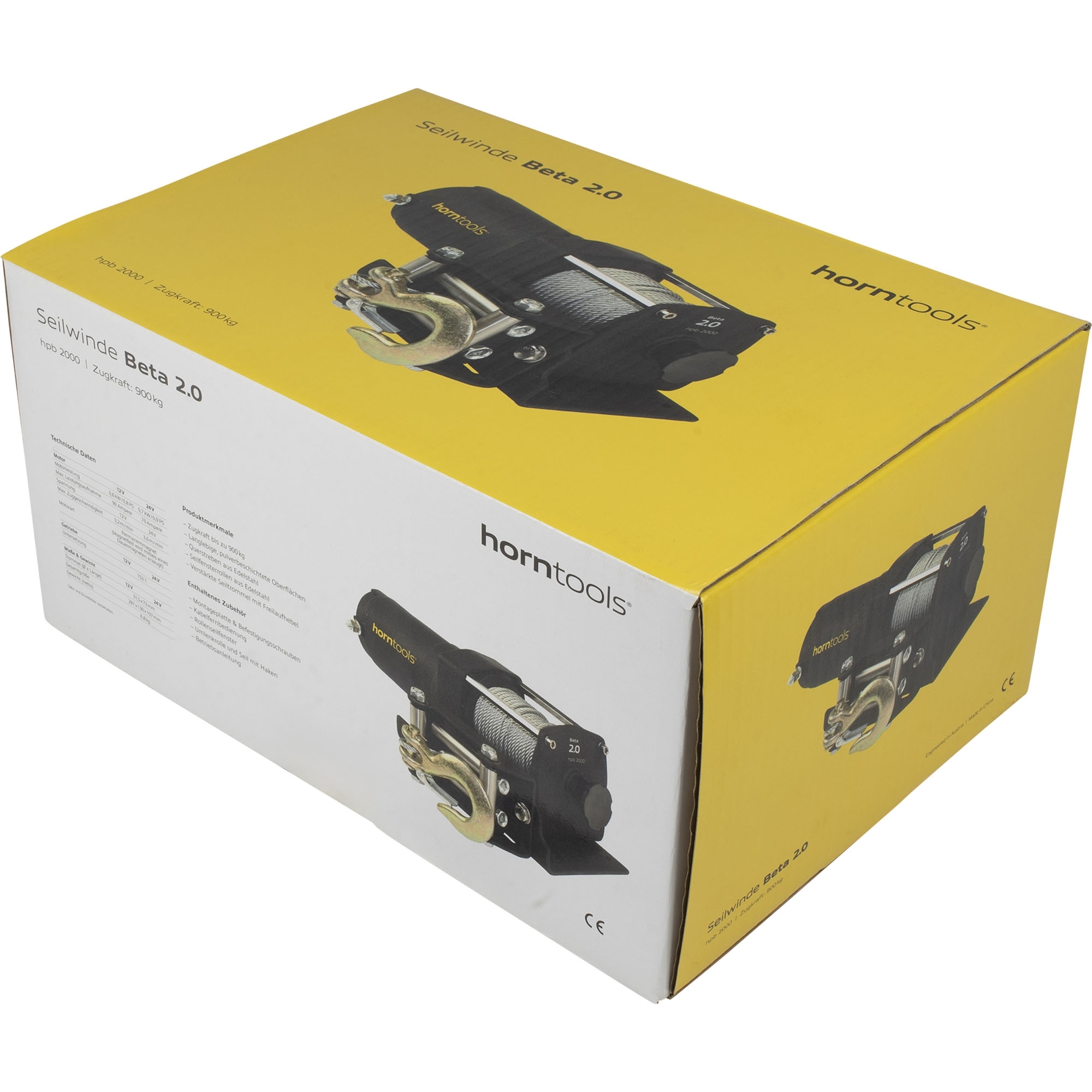 Winch HPB2000 Tensile force 900 kg Speed 3.2 m / min Reduction 153:1 Engine power 1.10 kW Voltage 12 Volt Max. Power consumption 90 A Steel cable Ø 4 mm Steel cable length 15 m Drum (Ø x L) 31.5 x 73 mm Dimensions 292 x 130 x 110 mm Content: Overrunning clutch, automatic brake Cable remote control Roller cable window (mounting only with optional mounting plate 017800105) Pulley with hook Winch can not be retrofitted with wireless remote control. Safety note: Cable winch not suitable for lifting loads, securing loads and transporting people!